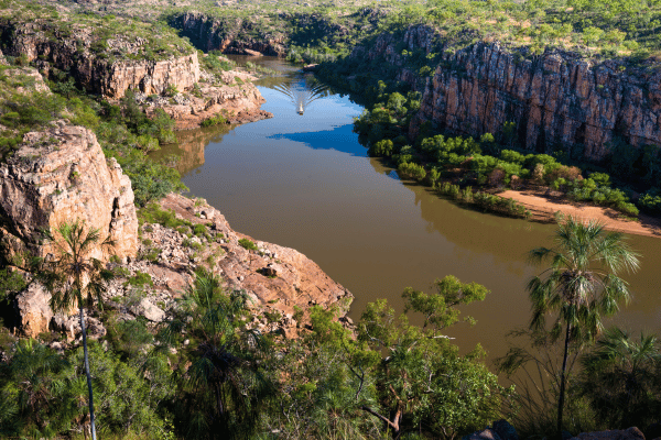 Nitmiluk Gorge is a large area and has 13 deep gorges that have been carved through the sandstone by Katherine River. Nitmiluk Gorge is about a three-hour drive from Darwin and can be done on a day trip or you can spend a night in the area.